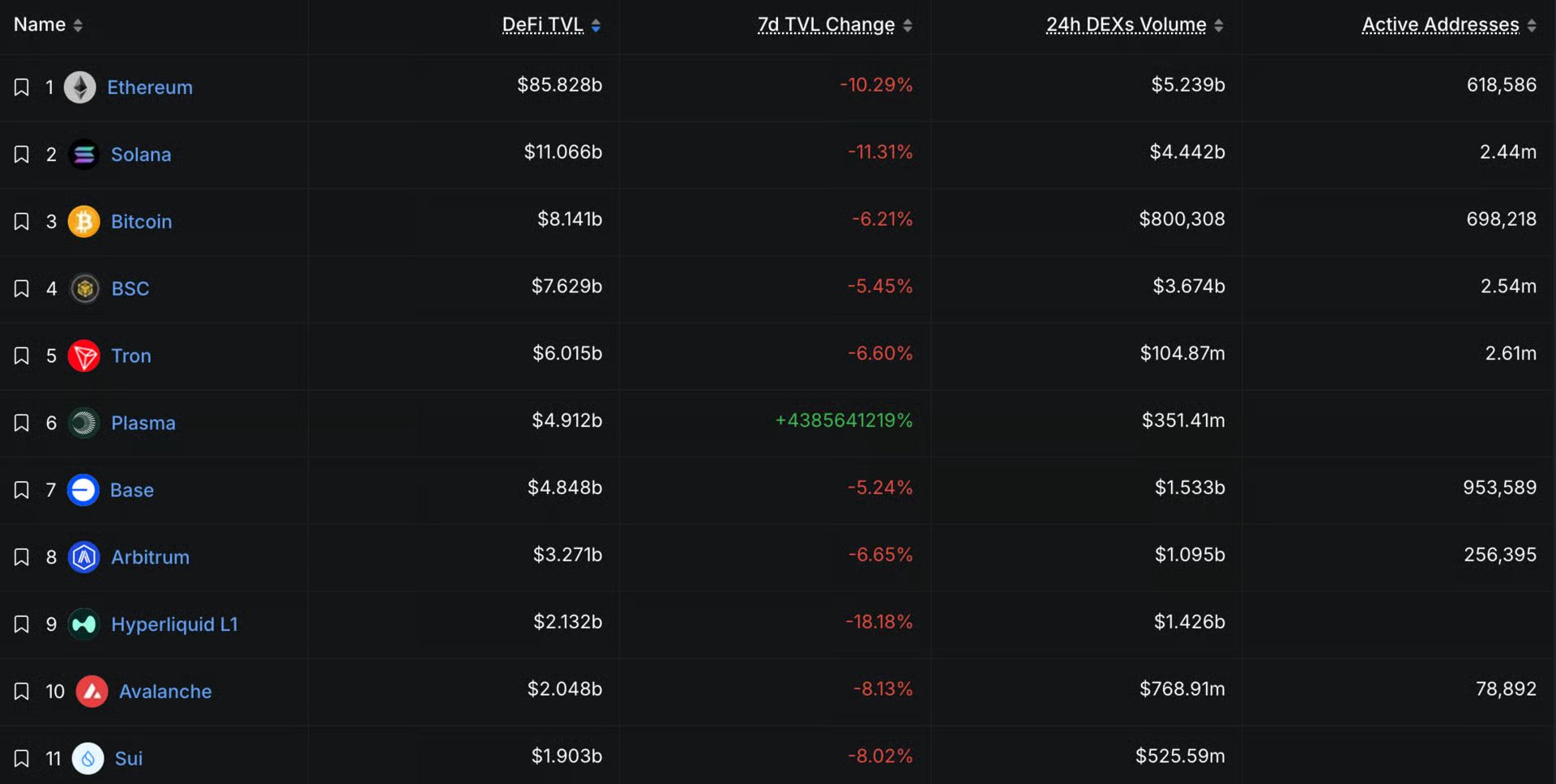 TVL across ecosystems declined sharply, reflecting the broader market downturn where most assets moved lower. No ecosystem stood out significantly, with the exception of Plasma.